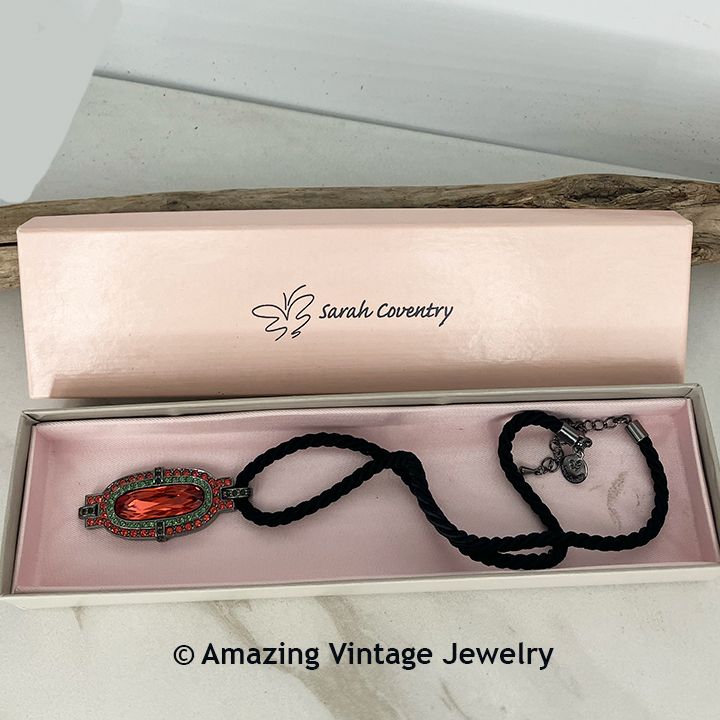 Necklace - Sarah Coventry. "BLAZE" from 2006. Huge pendant with red, green and black rhinestones on a black cord chain. Pendant is 2 1/4" long, 7/8" wide. Cord is adjustable from 16 3/4" to 18 3/4" long. Excellent condition in the original box - no card or padding in the box.