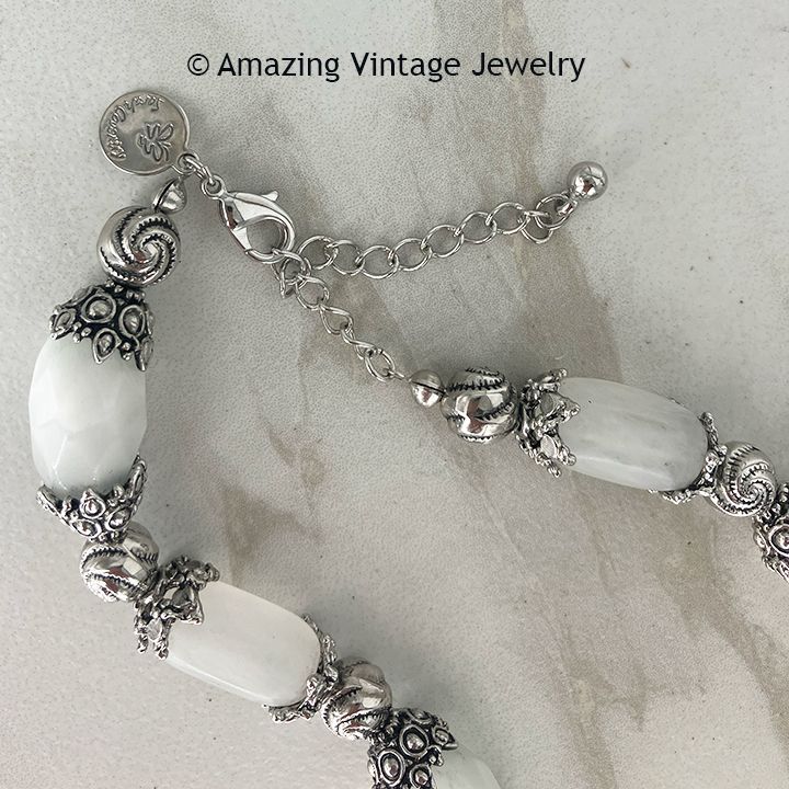 Necklace - Sarah Coventry. "AEGEAN" from 2003. Heavy frosted white glass beads with intricate silvertone end caps and spacer beads. This necklace is heavy and absolutely stunning! Adjustable from 16" to 18" long. Largest beads are about 15/32" wide. Excellent condition with no signs of wear.
