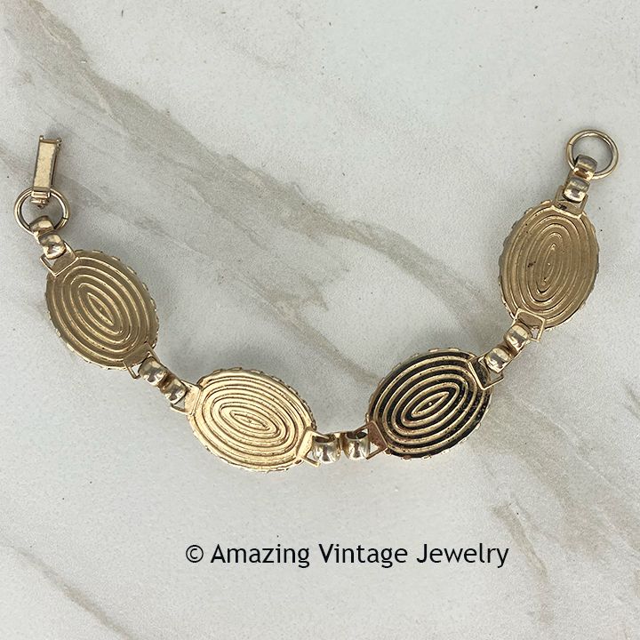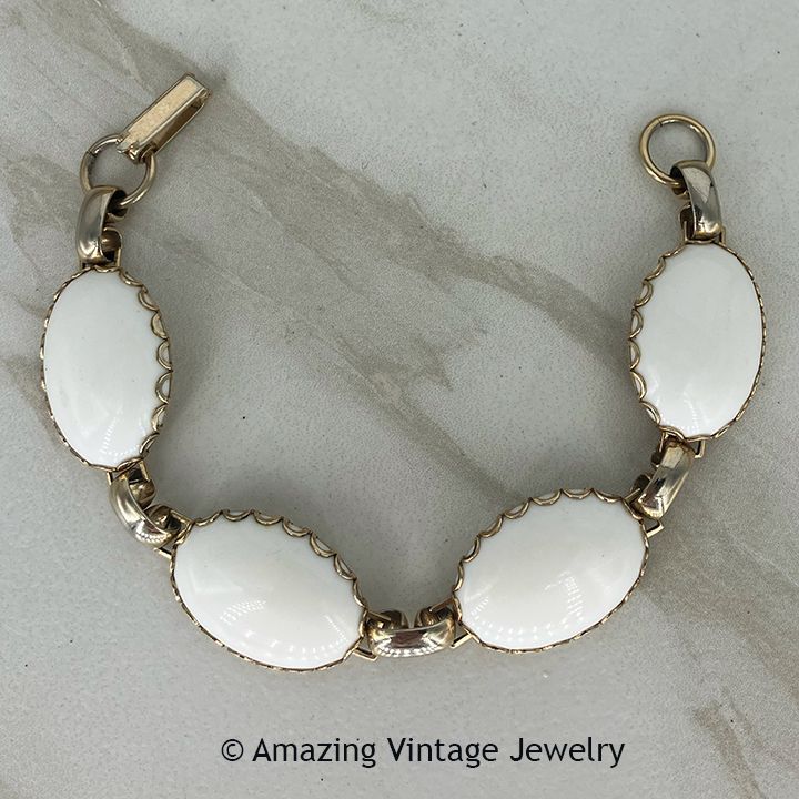 Bracelet - Sarah Coventry. "ARCTIC PEARL" from 1950. Goldtone frames with shiny oval white insets (not pearl or pearlescent as the name suggests). 7 3/8" long, 3/4" wide. Very good condition. Not marked. Shown in the Schiffer Collector's Guide: "Identifying Sarah Coventry 1949-2009" by Sturdivant and Crabtree. Overall good vintage condition with fading and wear to the goldtone. Ovals have a lot of wear to the edges on the back of the bracelet, as does the clasp. Photo shoes the actual piece you will receive.