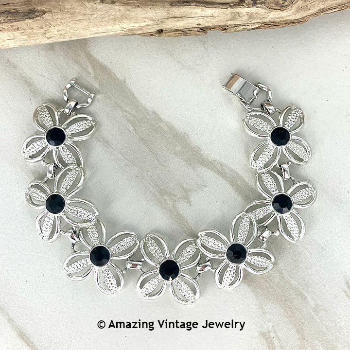Bracelet - Sarah Coventry. "BLACK BEAUTY" from 1967. Bright silvertone daisy links with faceted black stones in the center. 7 1/2" long, 7/8" wide. Very good condition.
