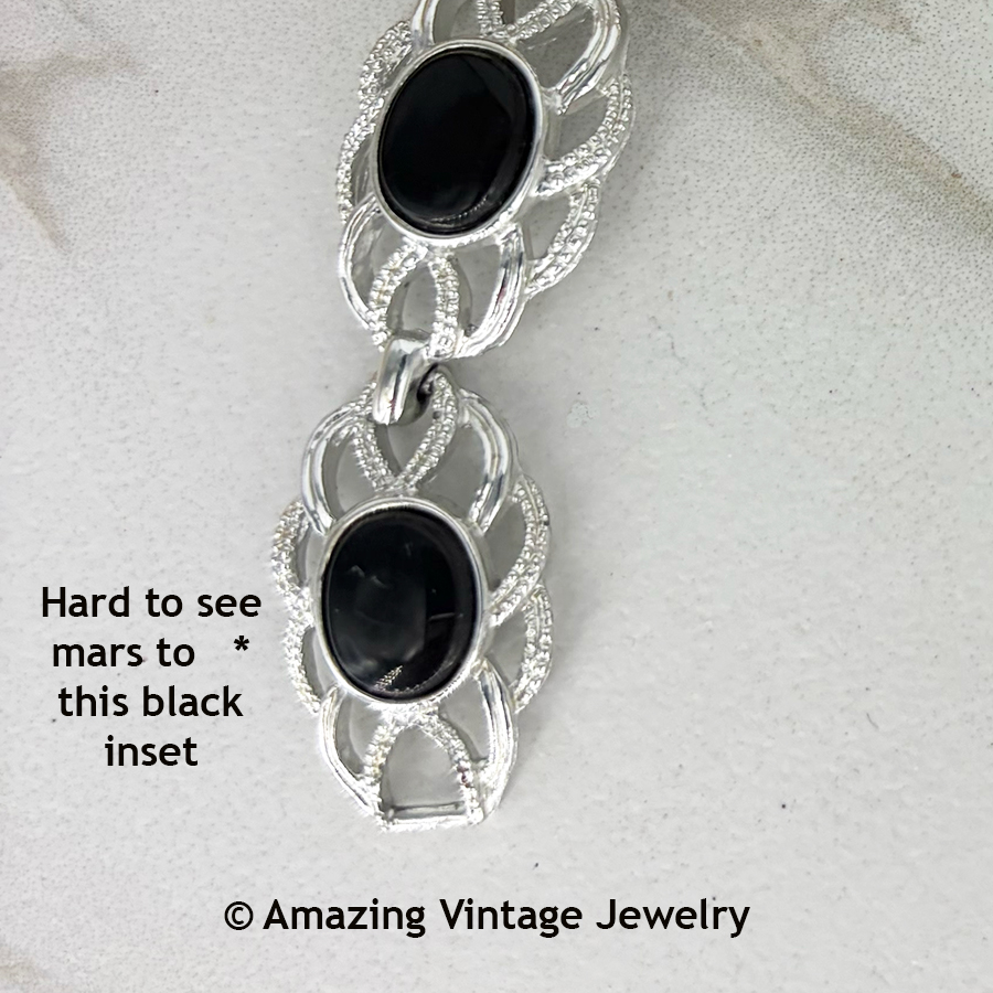 Bracelet - Sarah Coventry. "BLACK REFLECTIONS" from 1972. Show your fashion style with these loopy textured silvertone links with shiny black insets. 7 1/4" long, 5/8" across. Very good condition although one of the black insets has some mars - see the closeup photo.