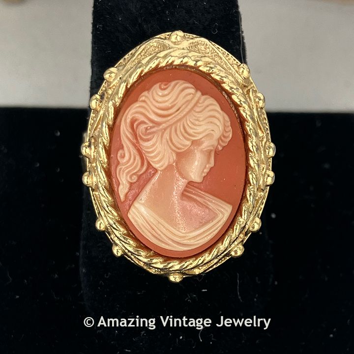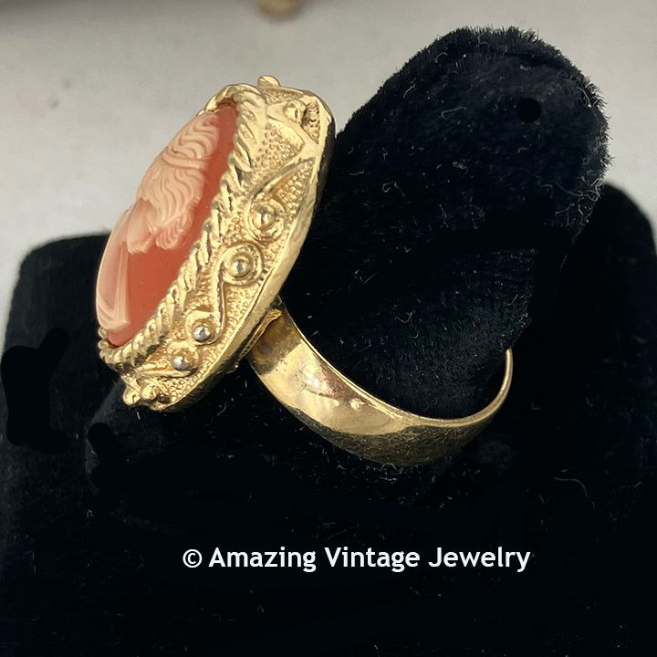 Ring - Sarah Coventry. "CAMEO LADY" from 1973. Goldtone frame with coral and cream cameo inset. Adjustable. Ring top is 15/16" long, 3/4" across. Very good condition.