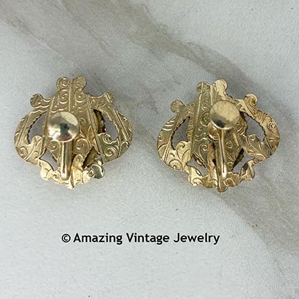 Earrings - Sarah Coventry. "CAMEO MAGIC" from the early 1950's. Shiny goldtone swirl frames with dark red/burnt orange and cream cameo insets. Pretty embossing to the back side of the earrings. Screwback. 1 1/4" across, 1" tall. Very good condition. Not marked but the pin is shown in the Sarah Coventry Inspirations pages.