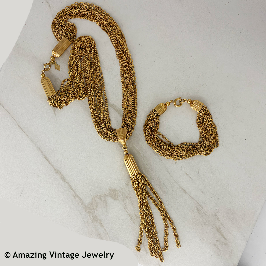 Necklace/Bracelet Set - Sarah Coventry. "CAREER GIRL" from 1964. Shiny ribbed goldtone cylinders with goldtone chain tassel. Wear necklace and bracelet together for a longer necklace - about 28" long. Bracelet is 7 1/2" long. Removable tassel is 5" long. Very good condition.