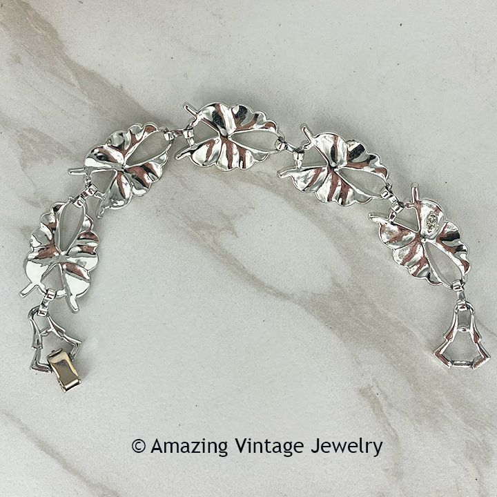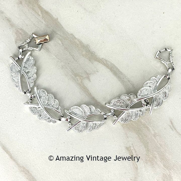 Bracelet - Sarah Coventry. "CHIC" from 1957, Textured silvertone leaf links with bright polished silvertone connectors. 7 1/2" long, 3/4" wide. Very good condition with some extremely hard to see dark spots in 2 of the links and the clasp is slightly discolored.