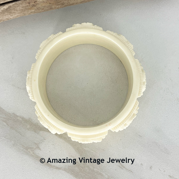Bracelet - Sarah Coventry. "COFFEE AND CREAM" from 1973. Molded plastic bangle in cream...Very attractive! 1 1/8" wide. Fits most wrists. Very good condition. This one came in cream only as shown and in tortoise brown and cream. This listing is for the all cream bracelet.