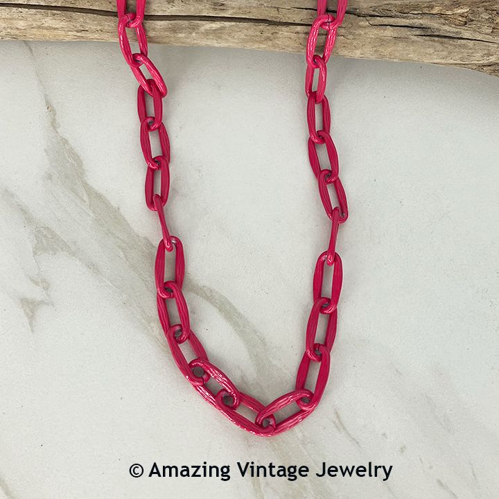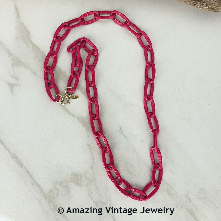 Necklace - Sarah Coventry. "COLOR LINKS" from 1984. Fuchsia enamel coated chunky links. Each link is about 1" long. This one came in several different colors: red, turquoise fuchsia and cream. 24" long. Very good condition. Some of the links did not get the full color where they join the next link. They are not chipped, just did not get the full color when manufactured. Enlarge the pics - this is the exact necklace you will receive.
