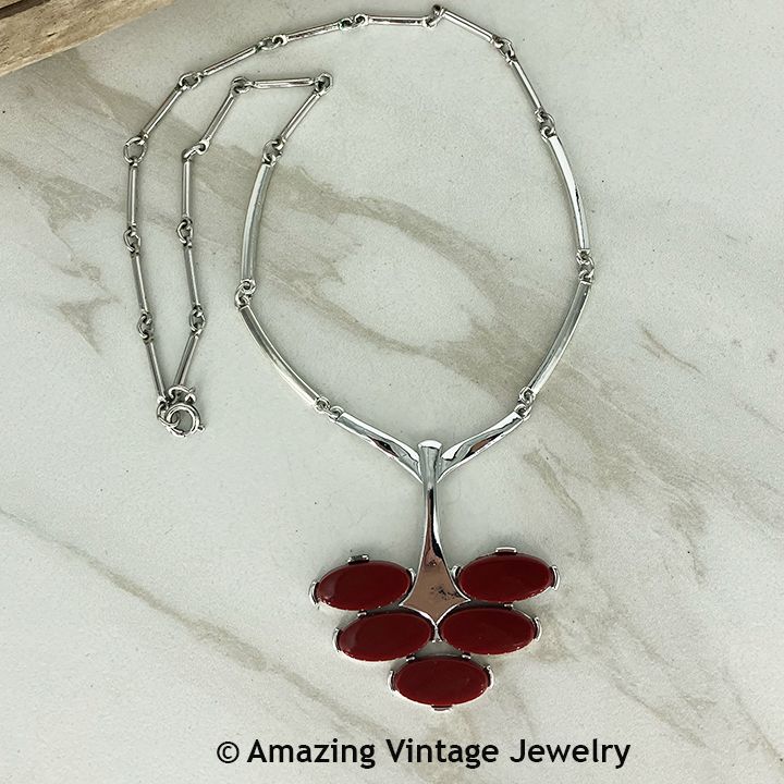 Necklace - Sarah Coventry. "CONTINENTAL" from 1977. Silvertone with rust-colored smooth oval stones. Adjustable up to about 17" long. Excellent condition.