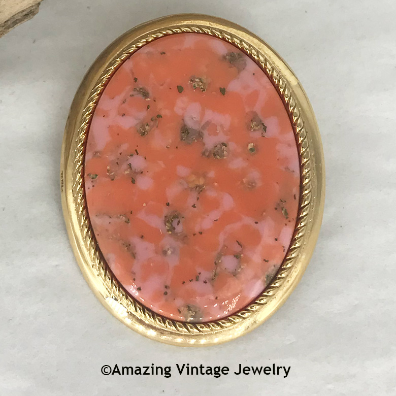 PIN - SARAH COVENTRY. "CORALINE" FROM 1974. INSPIRED BY THE BEAUTIFUL CORAL OF THE SEA, THIS PIN HAS A MARBLED CENTER STONE HAS GOLDTONE FLECKS THROUGHOUT AND NO TWO PIECES ARE EXACTLY ALIKE. PIN/PENDANT 1 7/8" LONG, 1 7/16" ACROSS. VERY GOOD CONDITION.
