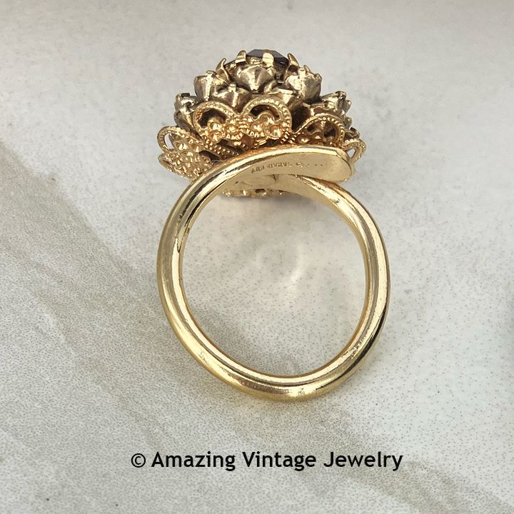 Ring - Sarah Coventry. "DEEP BURGUNDY" from 1966. Goldtone setting with red rhinestone cluster top, sure to be noticed! Adjustable. Ring top is 5/8" in diameter. Excellent condition.