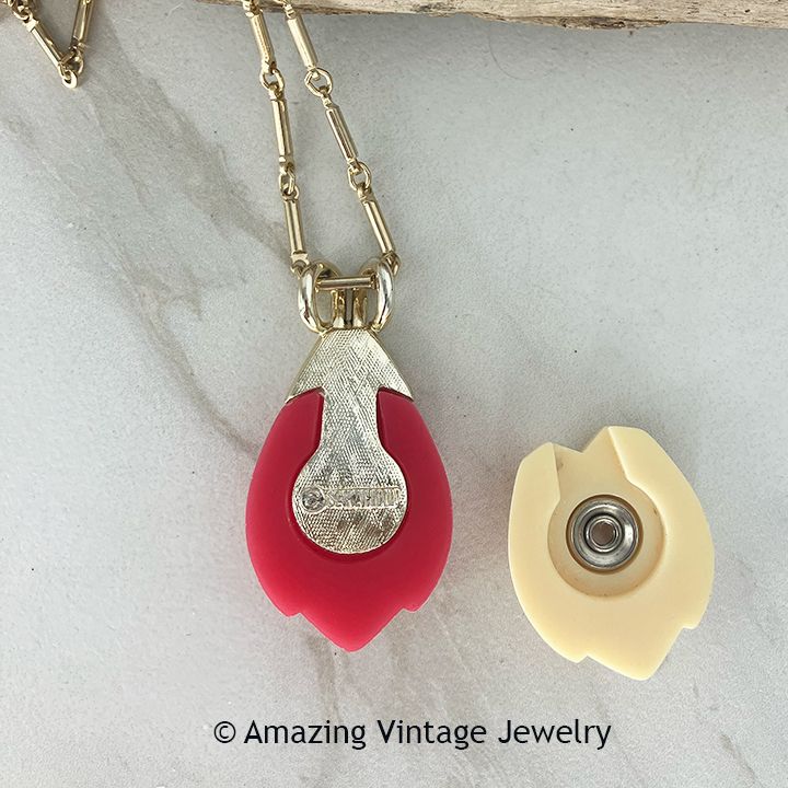 Necklace - Sarah Coventry. "DOUBLE CHOICE" from 1976. Textured long goldtone links with interchangable tulip pendants in rose and eggshell. Chain is 24" long. Pendants are about 2 1/8" long including goldtone topper. Very good condition with some hard to see scratches to the goldtone on the pendant portion.