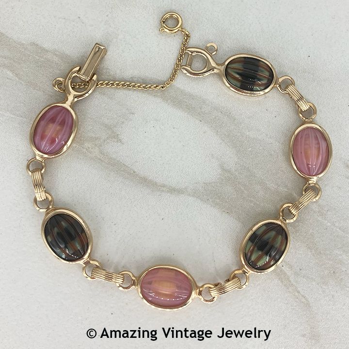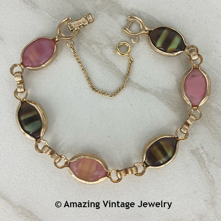 Bracelet - Sarah Coventry. "EARTH-TONES" from 1975. Goldtone frames with molded pink and neutral-colored striped insets. Safety chain. 7 5/8" long, 7/16" wide. Excellent condition.