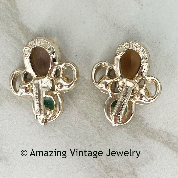 Earrings - Emmons. "AUTUMN HAZE" is the name given to me by a collector but I cannot verify that. Pretty autumn brown and green clear cabochons, accented with faux pearls. Goldtone is bright and shiny! Clip. 1 1/4" long, 15/16" across. Very good condition.