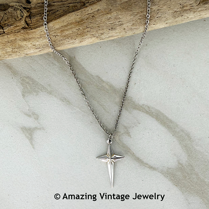 Necklace - Sarah Coventry. "FAITH" from 1966. Silvertone pointed cross in a danish-modern look. Pendant is 1" long, 5/8" across. Chain is adjustable to 16" and 18" long. Very good condition.