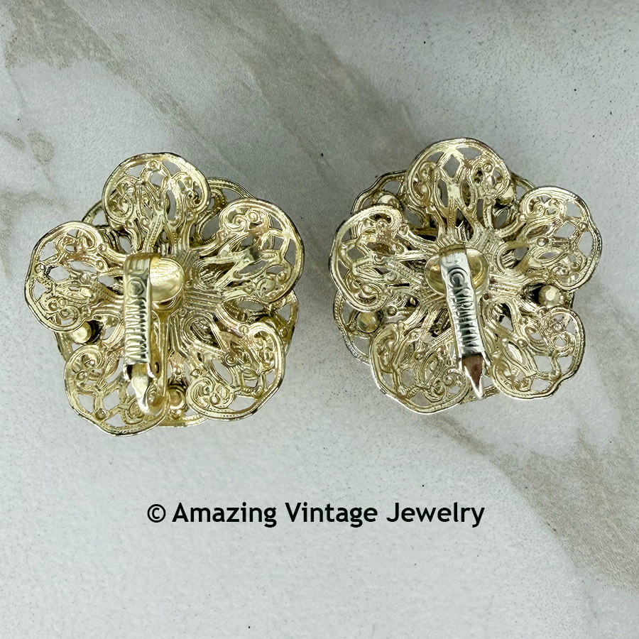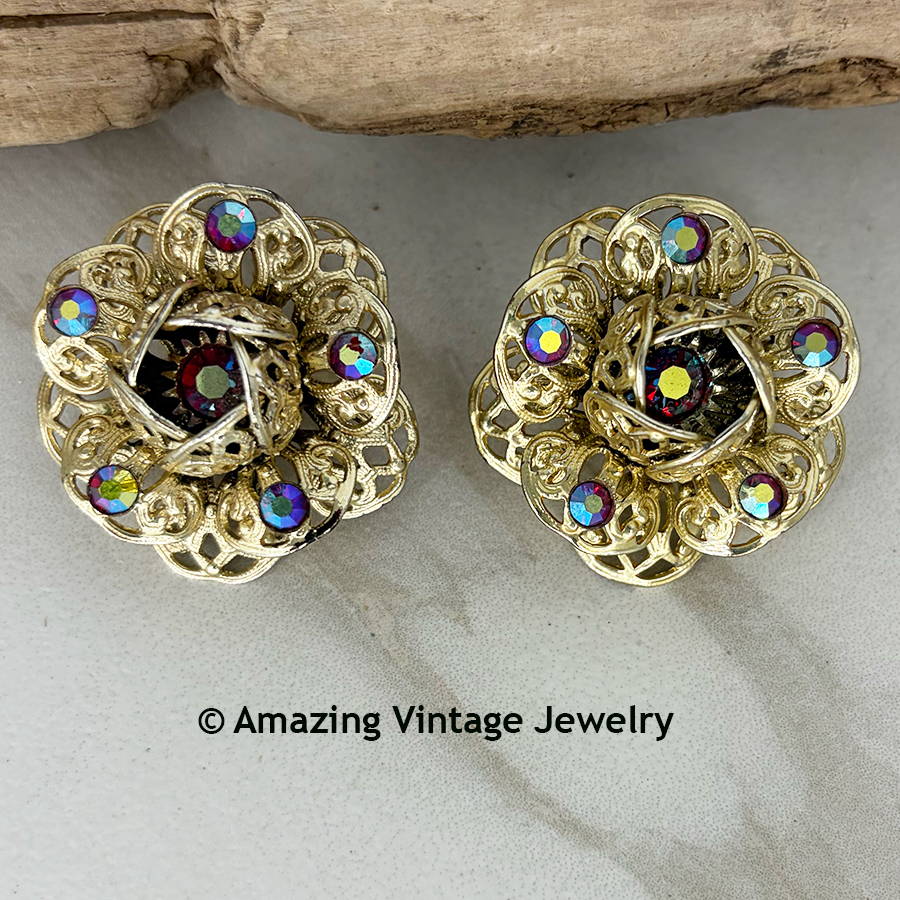Earrings - Sarah Coventry. "FASHION FLOWER" from 1961. Large, goldtone filigree flowers with stunning red Aurora Borealis stones. Clip. 1 5/16" in diameter. Very good condition. These are the small, "Dainty" version of these earrings although they are not very dainty. Very good condition.