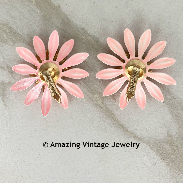 Earrings - Sarah Coventry. "FASHION PETALS" from 1968. Thiese large, fashionable flowers have shiny pink enamel petals with goldtone center. Clip. 1 3/8" in diameter. Very good condition.
