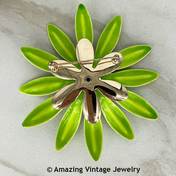 Pin - Sarah Coventry. "FASHION PETALS" from 1968. This large, fashionable flower has shiny green enamel petals with goldtone center. 3 1/8" in diameter. Very good condition with a teeny tiny chip to the tip of one of the petals - it doesn't even show up in the photo. Photo is the exact piece you will receive.