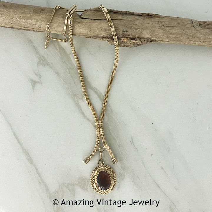 Necklace - Sarah Coventry. "FESTIVE" from 1974. Goldtone oval pendant with oval topaz rhinestone dangling from the center of the mesh chain. Pendant is about 1 5/8" long, 15/16" across. Total length of the chain is about 18" long. Very good condition.