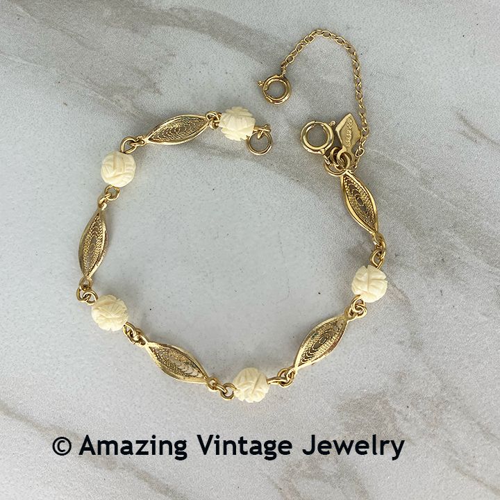 BRACELET - SARAH COVENTRY. LADY COVENTRY "FILIGREE IVORY" FROM 1970. A STYLE FIT FOR ONLY A TRUE LADY: DELICATE GOLDTONE LINKS WITH CARVED IVORY-LOOK BEADS. SAFETY CHAIN. 7 1/2" LONG. VERY GOOD CONDITION, ALTHOUGH THE GOLDTONE FINISH IS JUST A BIT DARK. PRICED ACCORDINGLY.