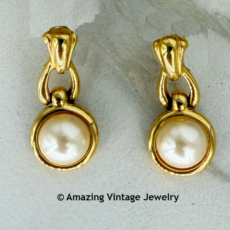 Earrings - Sarah Coventry. Round goldtone frames with creamy faux pearl insets. The round section attaches to the "stirrup" above and can move back and forth in a hinged motion. 1 1/4" long, 1/2" in diameter. Pierced. Very good condition. Probably from the 1990's - 2000's New Sarah lines. Marked SC on the back of the round portion.