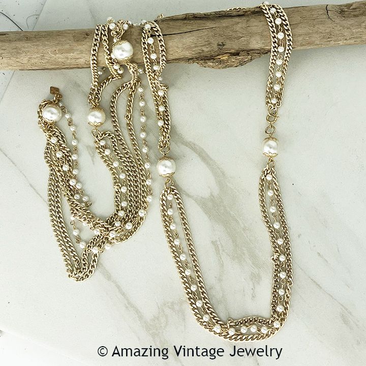 Necklace - Sarah Coventry. "INSTANT FASHION" from 1968. Shimmering faux pearls paired with goldtone chains for a classic look. About 51" long. Very good condition.