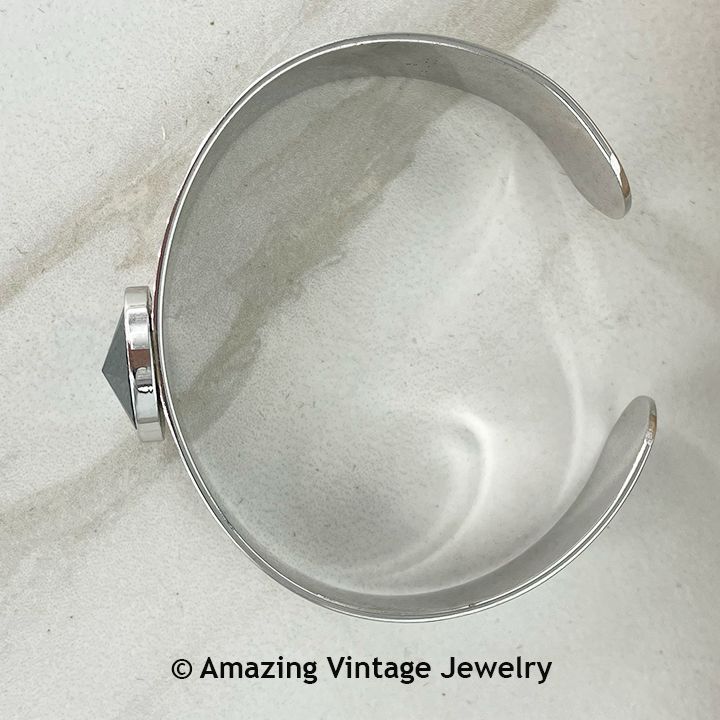 Bracelet - Sarah Coventry. "JET SET" from 1976. Bright, shiny silvertone cuff with a pointed austrian glass hematite-look setting. Fits most wrists. 5/8" wide. Very good condition with some very minor scratches that are hard to see. This bracelet looks like it was worn very little if at all.