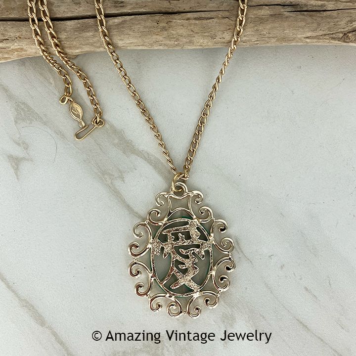 Necklace - Sarah Coventry. "MING GARDEN" from 1972. Bright goldtone reversible pendant - One side is textured goldtone, the green side features a green plastic cut-out overlaid on the goldtone. The Chinese symbol for "Love", although the image is upside down and that is the way that it was made by Sarah Coventry, per the 1972 catalog. Pendant is 2 5/8" long, 2" across. Chain is 24" long. Reversible - Goldtone only on the reverse side. Very good condition.