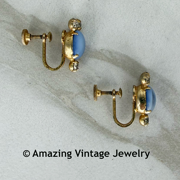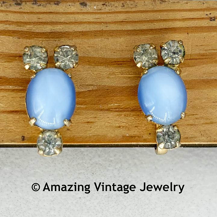 Earrings - Sarah Coventry. "MOONGLOW" from 1949. Beautiful light blue moonstone oval insets with clear rhinestone accents, set in goldtone. Screwback. 3/4" long, 7/16" across. Small. Very good vintage condition - there is a little discoloration to the goldtone of the loop on one and the clear rhinestones are not as bright as they once were. Very rare item. Not marked but shown in the Schiffer collectors guide by Sturdivant and Crabtree.