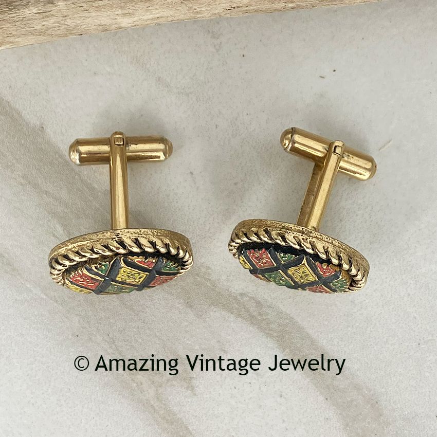 Cuff Links - Sarah Coventry. "MOSAIC" from 1972. Decorative and colorful look in goldtone disks with green, gold, and red stained glass look. 7/8" in diameter. Very good condition.