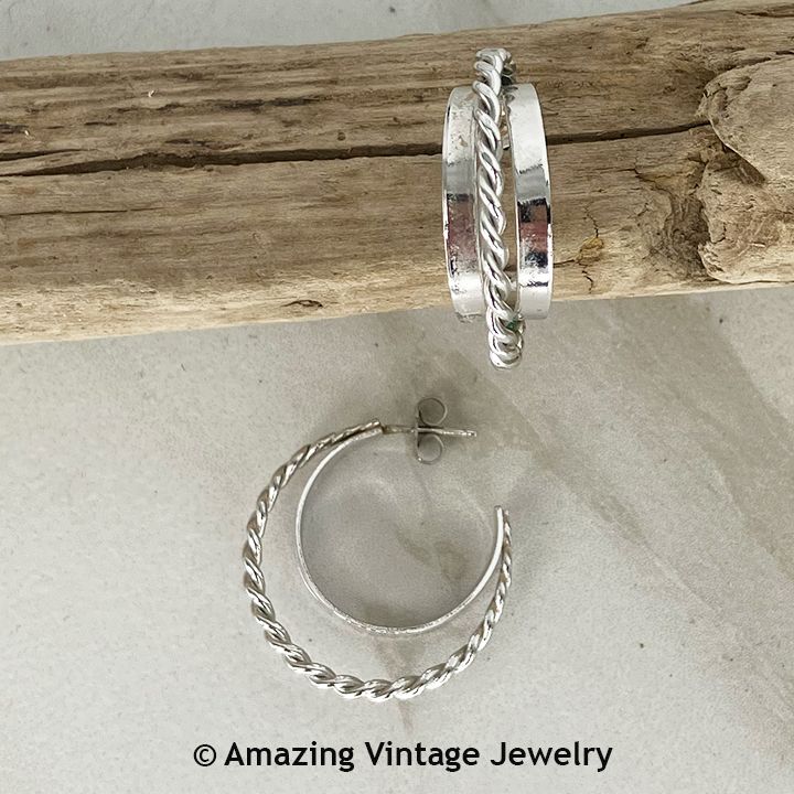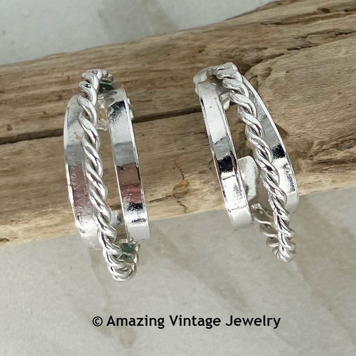 Earrings - Sarah Coventry. "PACESETTER" from 1972. Inner double shiny hoops with a braided larger silver hoop in between. Very 3-D. 1 1/16" in diameter. Very good condition. Wingbacks are not the same - 1 is marked SARAH but the other is not and is a slightly different shape.