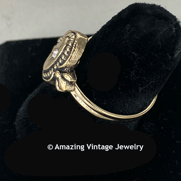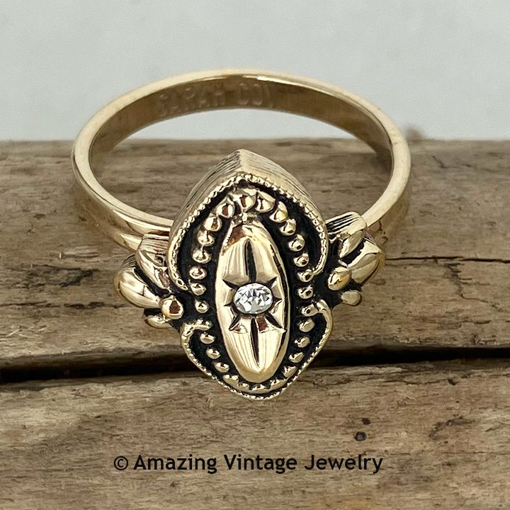 Ring - Sarah Coventry. "ROYAL CREST" from 1982. Antique look goldtone oval with center rhinestone. Ring top is 9/16" tall. Adjustable. Very good condition.
