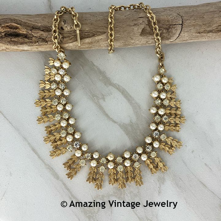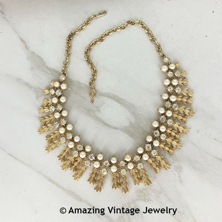 Necklace - Sarah Coventry. "ROYAL HIGHNESS" from 1962. Hinged textured goldtone sections with beautiful faux pearls and clear rhinestones. Adjustable up to 17" long, 1" wide. Good condition with some mars/scrapes to the faux pearls. Many of the clear rhinestones are cloudy, as shown in the photo. Goldtone on the chain has some dark areas. Priced accordingly - be sure to note the flaws and enlarge the photos prior to purchasing. Photos are the exact piece you will receive.