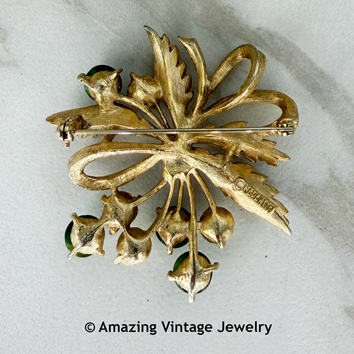 Pin - Sarah Coventry. "SPRING BOUQUET" from 1965. Satin goldtone with cultured pearls and emerald-green cabochons - no less than stunning! About 2 1/8" in diameter. Very good condition with some hard to see wear to the goldtone. The photos are the exact pin you will receive.