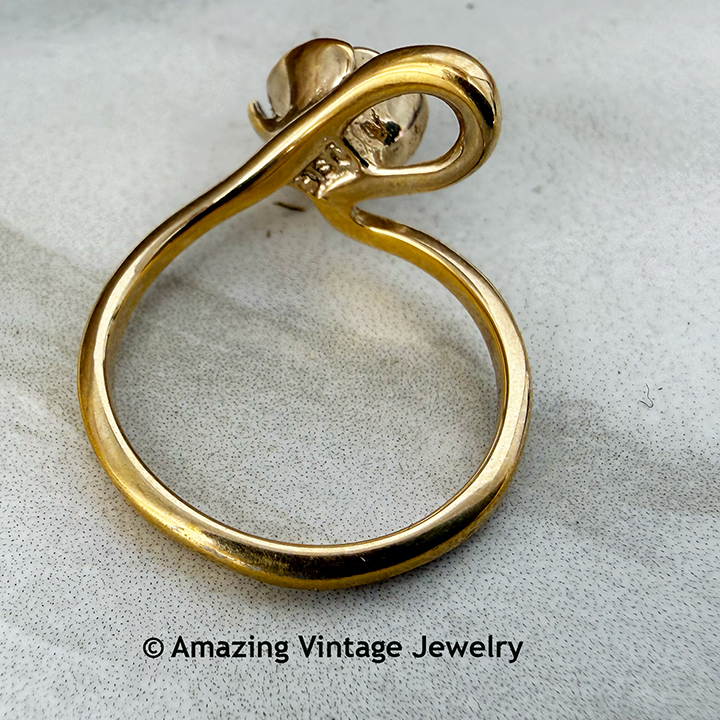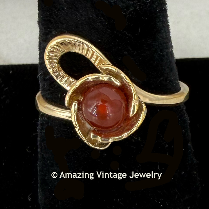 Ring - Sarah Coventry. "SPICE" from 1982. Interesting goldtone swirls with a cinnamon colored round bead. Ring top is about 1/2" long and across. Size 7 - not adjustable. Very good condition. Relatively rare.