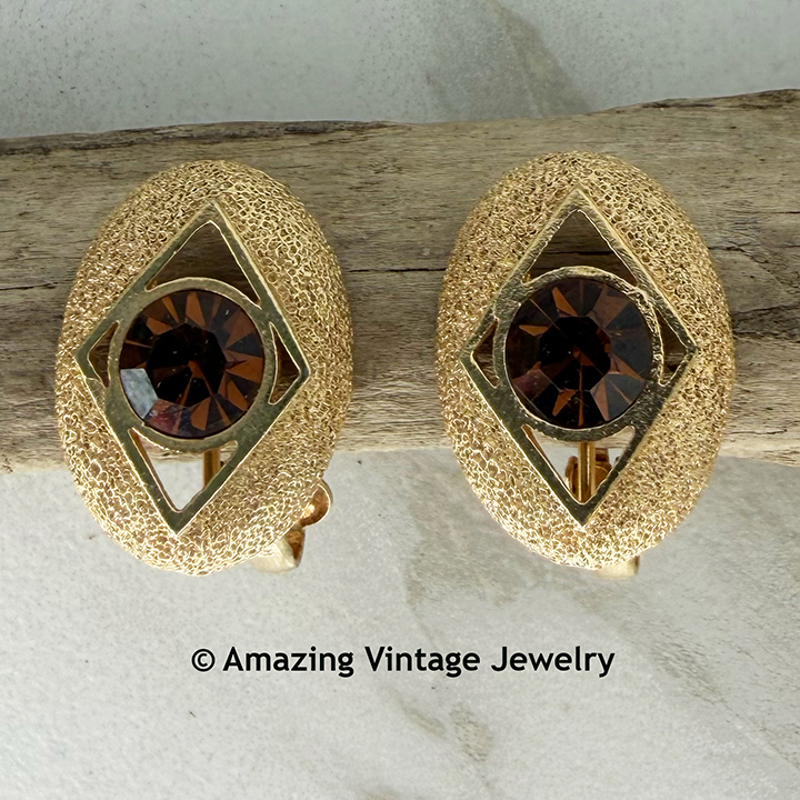 Earrings - Sarah Coventry. "STARBURST" from 1975. Heavily textured goldtone ovals with center topaz rhinestone. Clip. 1" long, 3/4" across. Very good condition.