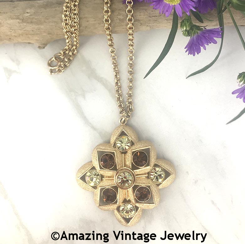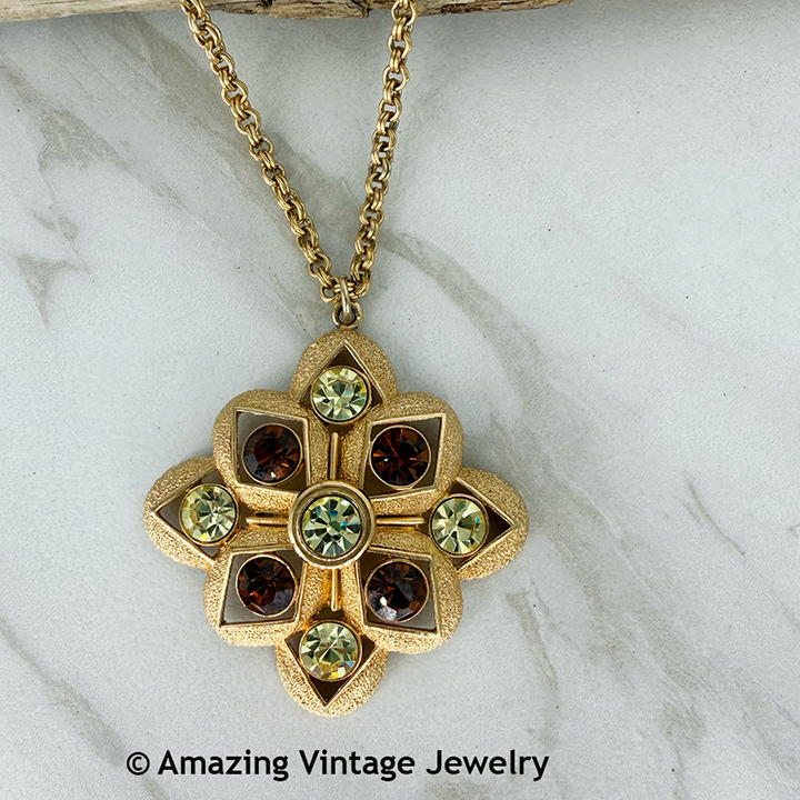 Necklace - Sarah Coventry. "STARBURST" from 1975. Huge, heavily textured goldtone with topaz and citron-colored rhinestones. Pendant is about 2 5/8" in diameter. Chain is 24" long. Very good condition