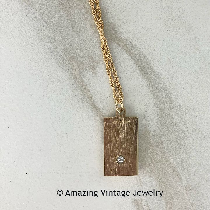 Necklace - Sarah Coventry. "STARCAST ZODIAC" - Gemini - from 1982. Gold retangular bar pendant with sagittarius symbol at the top and a silvertone banner with "Gemini" stamped into it. Pendant is 1" long, 1/2" across. Chain is 20" long. Originally sold as a men's necklace, but is definitely a gender neutral piece. Excellent condition.