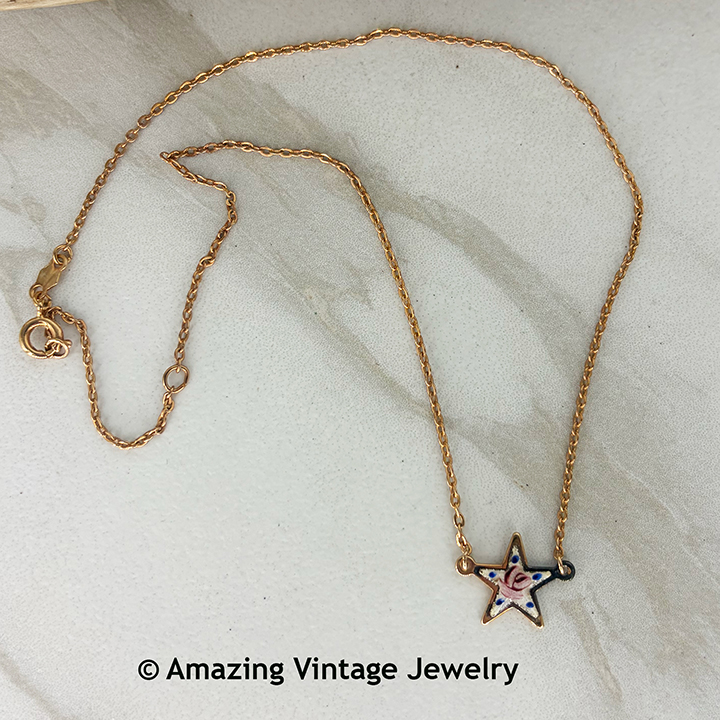 Necklace - Sarah Coventry. "STARLET CHOKER" from the Little Sarah line of 1978. Anyone can wish upon this star: A goldtone star pendant with enamel trim. Star is 9/16" in diameter. Necklace is 15" long. Very good condition. Hard to find this one without deterioration to the enamel - but this one looks great with the exception of the right "arm" of the star being a little dark from the heat processing of the enamel.