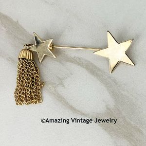 Stickpin - Sarah Coventry. "STAR SHOWER" from 1976. Shiny stars, one large and one smaller, with goldtone fringed cap. Relatively large for a stickpin - 2 5/8" long. The large star is 15/16" in diameter. Very good condition with some minor scratches to the goldtone.