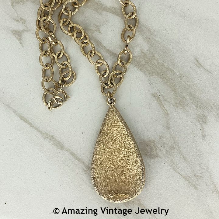 Necklace - SARAH COVENTRY. "SULTANA" from 1959. Goldtone with confetti-look raised design and multi-colored rhinestones. Pendant is 2 7/16" long, 1 1/4" across. Very good condition.