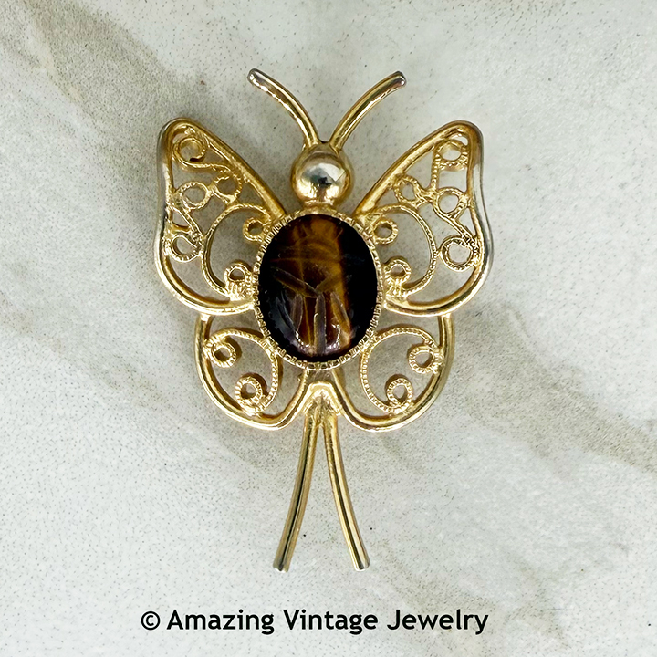 Pin - Sarah Coventry "TIGER EYE BUTTERFLY" from the 1975 Lady Coventry line. Ornate goldtone butterfly with a center scarab-carved tiger eye inset. About 1 1/2" long, 1" across. Very good condition.