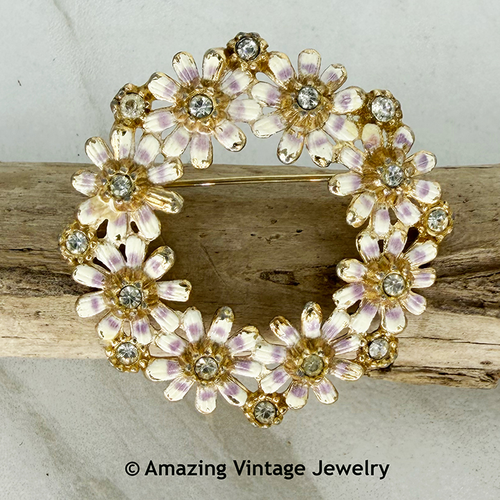 Pin - Sarah Coventry. "WILD FLOWER" from 1953. Gorgeous goldtone flowers with white and purple enamel and rhinestone accents. About 1 13/16" in diameter. Very good vintage condition with some minor chipping to the enamel - see the closeup photo. To me, it is not as noticeable in person as it is in the hi-res photos. Not marked but shown in the Schiffer collector's guide by Sturdivant and Crabtree. Also listed in the Sarah Coventry Inspirations pages.