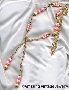 NECKLACE - SARAH COVENTRY. "CAROUSEL" FROM 1968. WITH THE COLORS AND GAIETY INSPIRED BY A CARNIVAL - GOLDTONE CHAIN WITH SHAPED WHITE, ORANGE, AND PINK BEADS. SAUTOIR STYLE (OPEN-ENDED AND CAN BE TIED, LOOPED, ETC.). TOTAL LENGTH IS 41 1/2" LONG. EXCELLENT CONDITION.