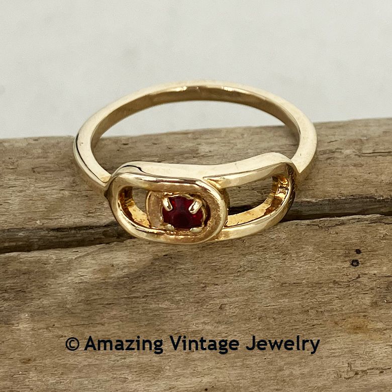 Ring - Sarah Coventry. "CHRISTA" from 1980. Goldtone open buckle look with center red rhinestones. Size 6 - not adjustable. Ring top is 1/4" wide. Very good condition. Marked SC. Relatively rare item.