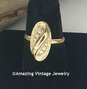 RING - SARAH COVENTRY. "EVERLASTING" FROM 1982. GOLDTONE DIVIDED OVAL WITH CLEAR RHINESTONES. ADJUSTABLE. VERY GOOD CONDITION WITH SOME MINOR SPOTTING AND DISCOLORATION TO THE BAND.