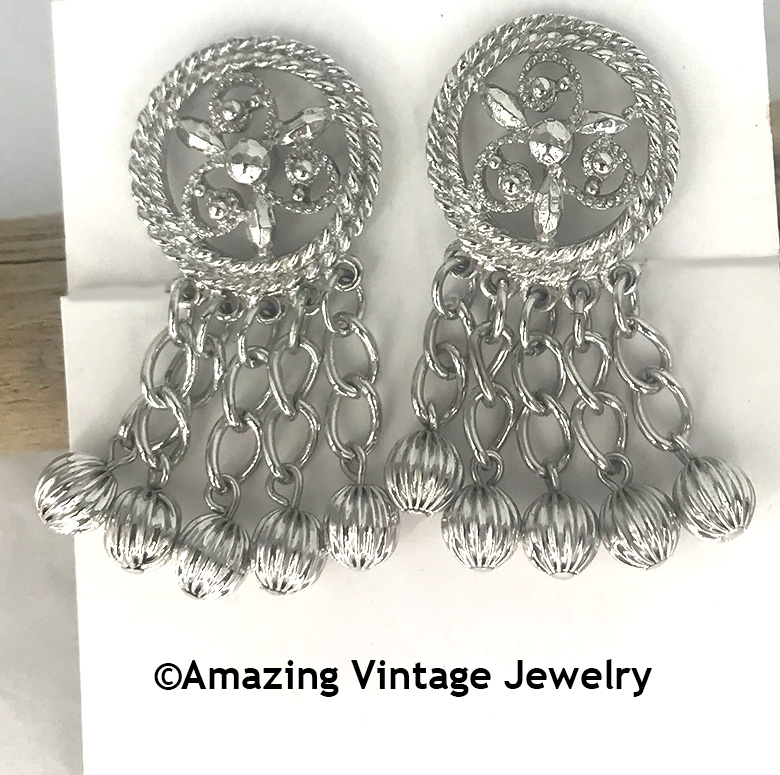 EARRINGS - SARAH COVENTRY. "FASHION IN MOTION" FROM 1969. DETAILED OVAL SILVERTONE PIN WITH HANGING CHAINS WITH TEXTURED BALLS AT THE BOTTOM. CLIP. VERY GOOD CONDITION.