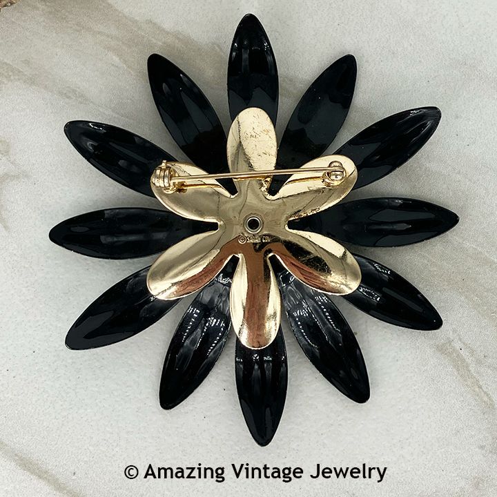 Pin - Sarah Coventry. "FASHION PETALS" from 1968. This large, fashionable flower has shiny black enamel petals with goldtone center. 3 1/8" in diameter. Very good condition.