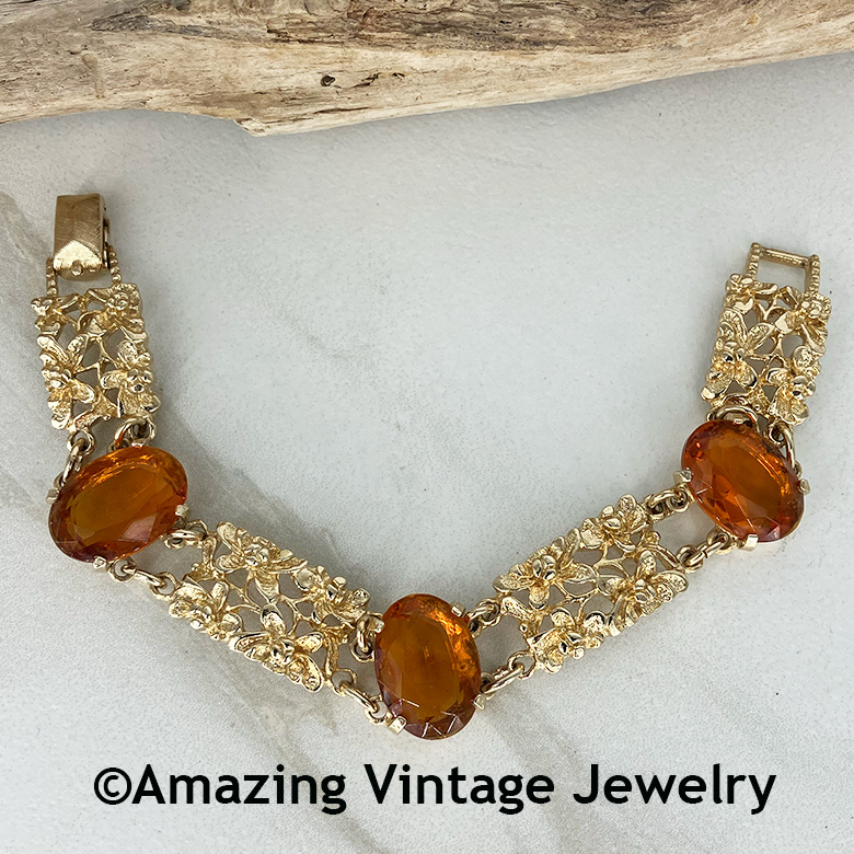 Bracelet - Sarah Coventry. "FLORENTINE" - Made in Great Britain. Intricate goldtone leaf segments with large oval, faceted topaz rhinestones. 7 1/2" long, 3/4" wide. Very good condition.