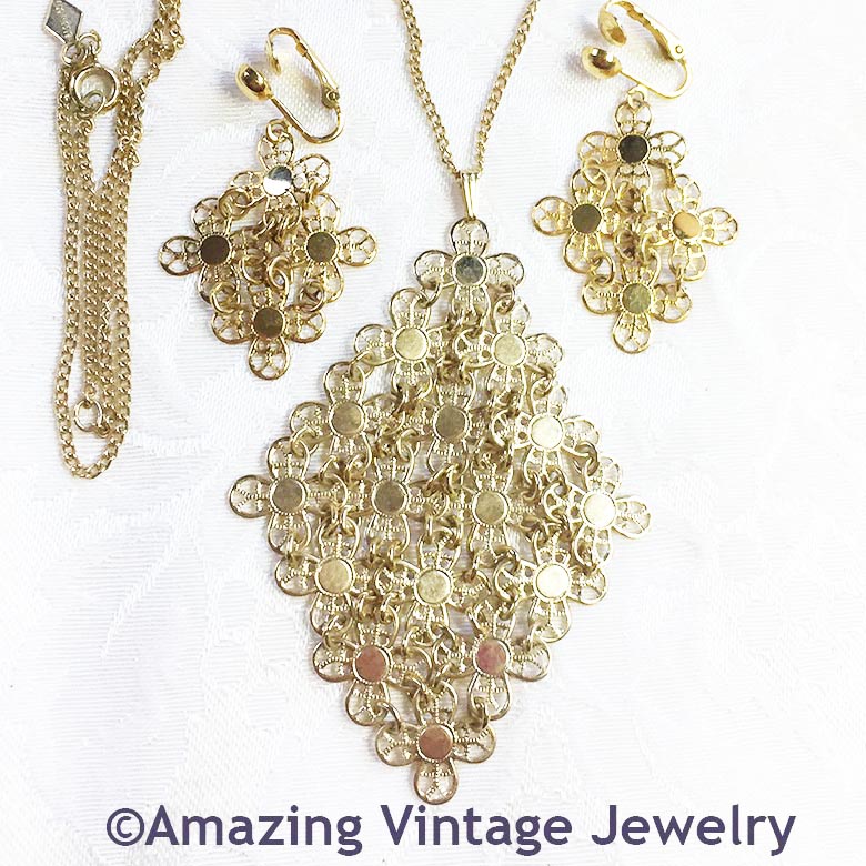 NECKLACE & EARRINGS SET - SARAH COVENTRY. "GOLDEN PETALS" FROM 1971. DELICATE, DETAILED GOLDTONE FLOWERS HINGED TOGETHER TO FORM A DIAMOND-SHAPE MESH PENDANT THAT ARE TRULY UNIQUE. PENDANT IS ABOUT 3 5/8" LONG, 2 5/16" ACROSS. VERY GOOD CONDITION. EARRINGS ARE CLIP. ABOUT 2" LONG, 1 1/8" ACROSS. VERY GOOD CONDITION.