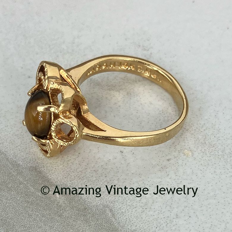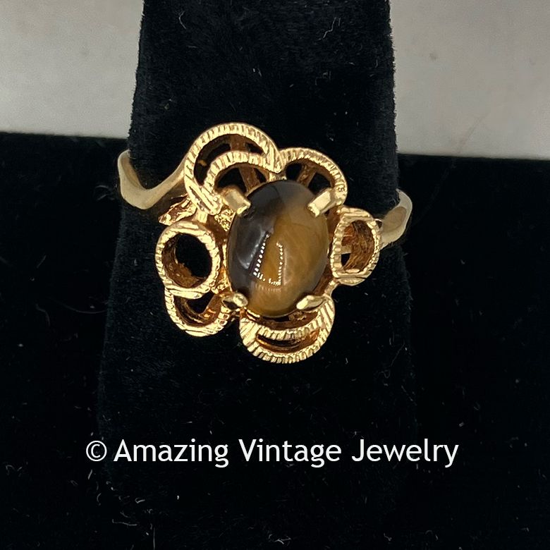 Ring - Sarah Coventry. "HORIZONS" from 1978. Earned as a Hostess gift only - never offered for sale. Goldtone asymmetrical goldtone setting with genuine tiger eye oval cabochon. Size 6 - not adjustable. Very good condition.